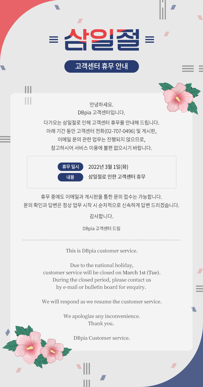 게시판 상세 제목 고객센터 삼일절 휴무 안내 (2022년 3월 1일) 등록일 2022.02.28 첨부파일 등록된 첨부파일이 없습니다. -